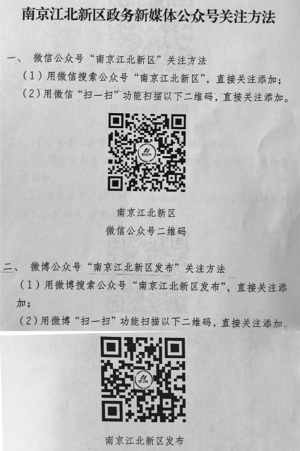 根据中共南京市委江北新区工作委员会宣传部《关于商情协助推广江北新区政务新媒体公众号的函》的文件精神,为增进广大教职工和学生对南京江北新区的了解,师生们可根据各自需求,关注江北新区微信公众号“南京江北新区”和微博公众号“南京江北新区发布”。