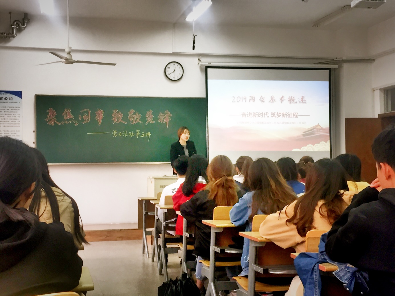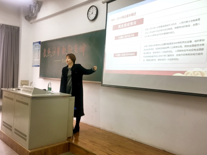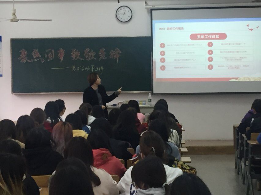 宣讲会中,江老师简单带领同学们一起学习了两会的基本概况(会议概况、会议由来、两会组成情况)、八大看点以及政府工作报告,然后以“四个意识”为重点展开了深入讲解。国家在塑造英雄意识,党员要有先锋模范意识。江老师提出,我国在这五年中取得了举世瞩目的成绩,这是每一位向党组织靠拢的人都应该有所了解的,并强调了深入学习贯彻习近平新时代中国特色社会主义思想的重要性,指出我们要提高政治站位。政治站位,是“四个意识”的集中体现,是衡量一名党员干部合格与否的重要标准。
