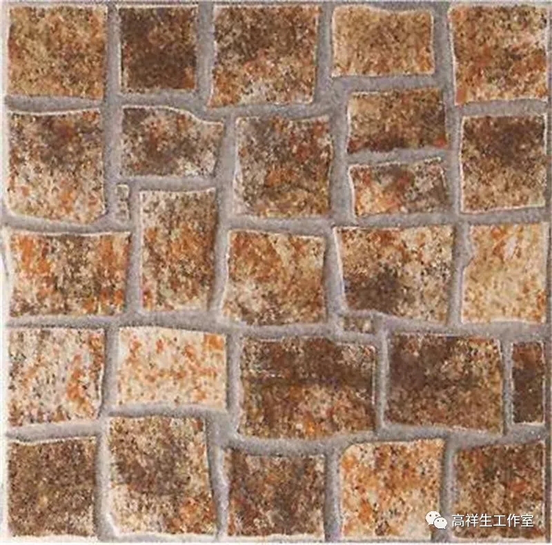 常见彩釉砖品种有仿古砖(图 3-2-4)、渗花砖、金属光泽彩釉砖等,可用于各类建筑的室内外墙面及地面装饰。