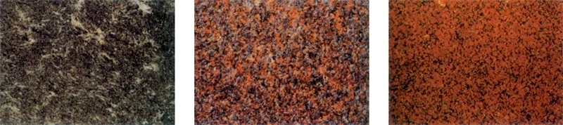 我国的天然花岗石品种约 300 多种,较有名的有:四川红、黑金沙、济南青、广西的岑溪红、福建灰色、山西的贵妃红、内蒙古的丰镇黑、河北的中国黑、山东的将军红等。进口的花岗石较有名的有:印度红、美国白麻、蓝钻、绿晶、巴西蓝、瑞典紫晶等(图2-2-2)。