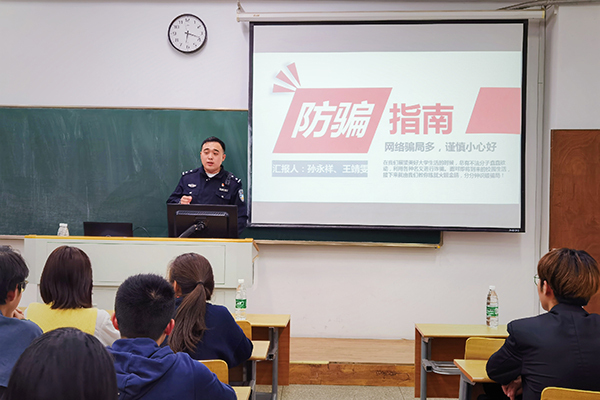 4月19日晚,学院邀请泰山新村派出所陆建兵警官和陈轶伟警官来到2020级学生主题班会现场专程指导开展校园防诈骗宣传活动。陆警官以“全覆盖、无盲区、人人皆知”为准则,分析辖区内电信诈骗案件的类型特点,并结合工作中遇到的真实案例,深入浅出地分析了各类通讯网络诈骗手段的特点,提醒大家提高辨识力和防范力。陈警官结合常见诈骗手法进行了条分缕析的解读,揭示了事发时犯罪嫌疑人和当事人的心理变化及行为逻辑,指出了预防通讯网络等诈骗的关键所在。随后,警官为大家分发防诈骗宣传传单。