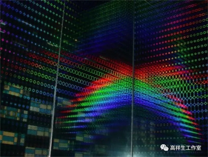 镭射玻璃经照射所产生的艳丽的色彩和图案可因光线的变化而变化(图 4-2-6),适用于休闲场所,如商场的装饰部位。