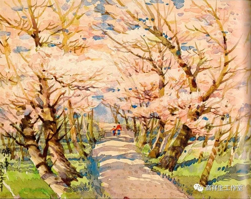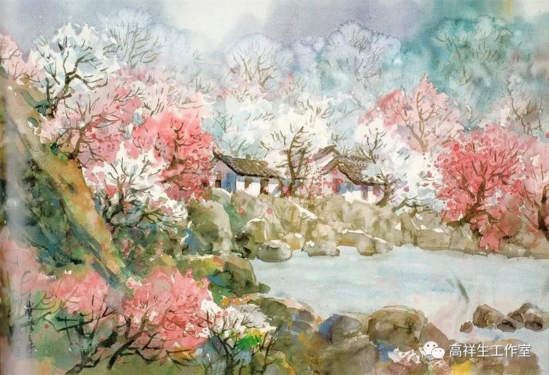 《桃源人家》画的是梅花山东南角的景致(现在建筑已扩建、改建)。崔老师绘画中用湿画法表现远景时因用水多了,画面上方出现水渍返回(作水彩画常出现此现象)的情况,在出现这种情况后崔老师就水渍的形状整合成远处的白梅树,效果很好(图 8)。