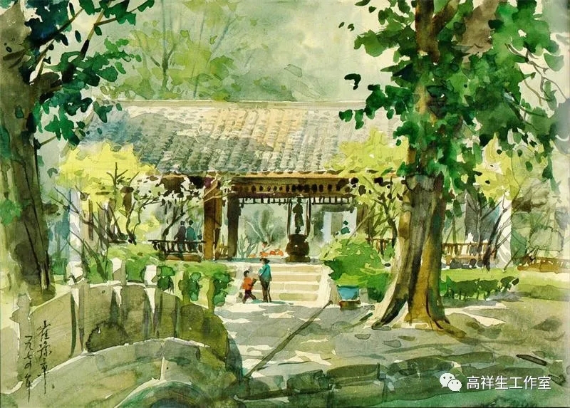 我在成都看了崔老师画杜甫草堂的全过程。杜甫草堂的空间环境也很局促,近景的树与远景的树感觉上几乎粘在一起,崔老师作画时干脆将远景的树处理成一片灰绿色的、朦朦胧胧的树林,而将近处的树的色调加深,并以生动的笔触着重表现了树叶飘逸的姿态;然后又以较明亮的色彩,表现了杜甫草堂的建筑和邻近的淡黄色树木,最后再以小笔触勾勒出杜甫草堂和环境的细部(图 6)。