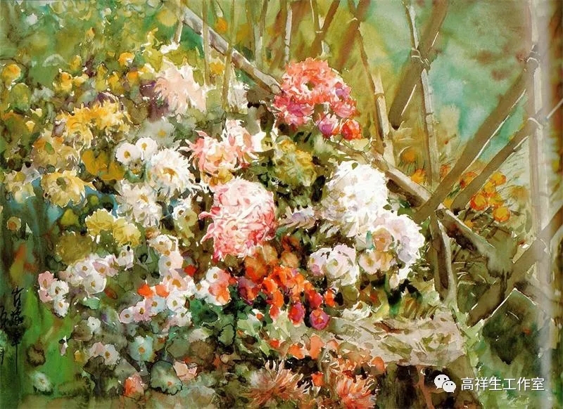 我见到的优秀水彩画花卉作品较少,而且大都是表现室内一组静态的花卉,像崔老师表现如此庞大的花卉场景,我是第一次见到。