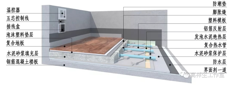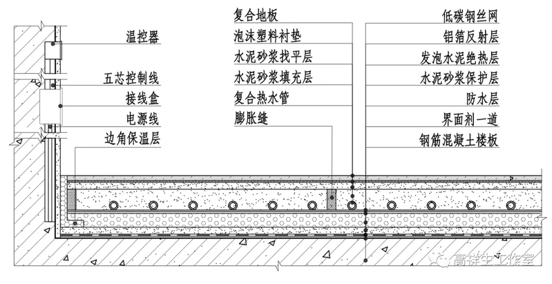 图 12-9-7 复合地板水暖地面构造节点图(发泡水泥绝热层)