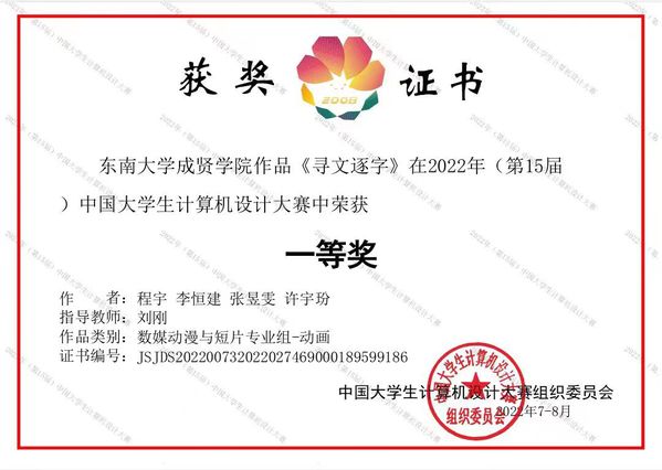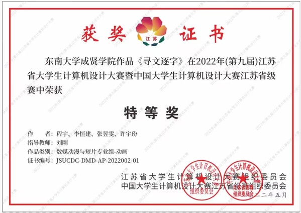 近日,2022年(第15届)中国大学生计算机设计大赛落下帷幕。由Beat365唯一官方网站动画专业刘刚老师指导的程宇、李恒建、张昱雯、许字玢等学生团队作品《寻文逐字》继获得江苏省“特等奖”后,荣获国赛“一等奖”。
