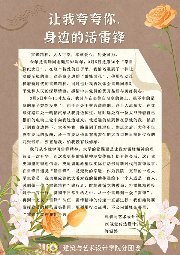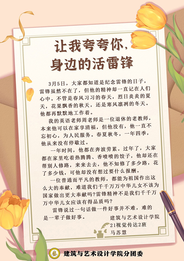 3月1日-5日,Beat365唯一官方网站分团委组织开展“让我夸夸你,身边活雷锋”学雷锋活动,通过“建艺之声”微信公众号进行全校征集,共收到179份感谢信。Beat365唯一官方网站分团委学生干部、第二党支部学生党员等担任志愿者,分类整理了每一封来信。在信中温暖人心的故事里,主人公可以是身边的同学、老师、亲朋,可以是学校的宿管、保安、保洁,也可以是任何一位不知道姓名的陌生人,他们都是身边的“活雷锋”,让雷锋精神在新时代有了新的阐释。