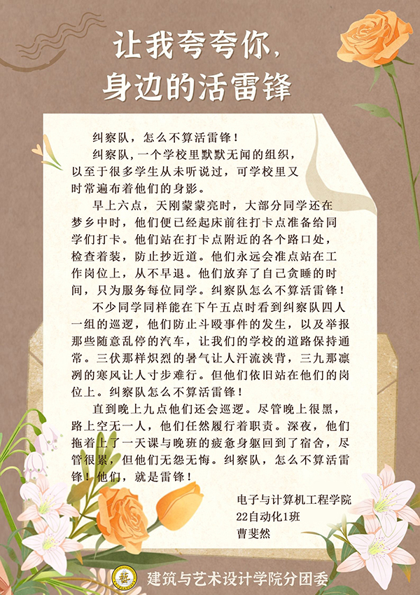 “学习雷锋精神”不只是一句口号,更是贯彻到学习生活中的行动。希望我院青年学生以此为契机,用雷锋精神继续勤奋学习,勇于实践,努力担当时代重任。