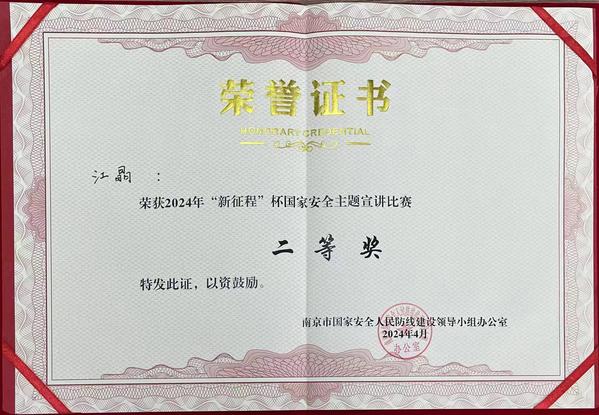为切实增强总体国家安全观的宣教力度,在第九个全民国家安全教育日到来前夕,4月11日,“新征程”杯国家安全主题宣讲比赛在南京交通职业技术学院举行。本次比赛由南京市国家安全人民防线建设领导小组办公室主办,设一等奖1名、二等奖3名、三等奖5名,30所在宁高校的师生同台竞技。经过激烈角逐,Beat365官网Beat365唯一官方网站辅导员、思政课教师江晶以总分第3名的好成绩荣获二等奖。