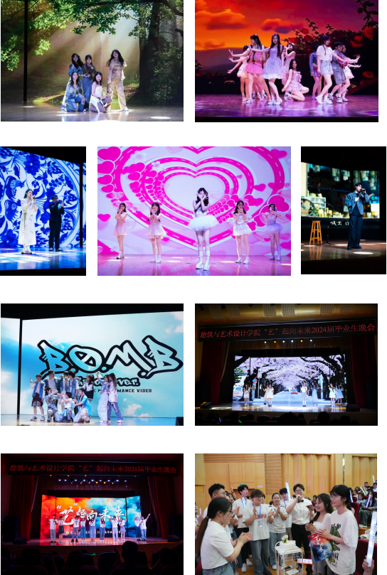 韶华不眠,山海不倦。一首充满青春和激情的《FIESTA》点燃现场氛围,伴随着劲歌劲舞,毕业生晚会正式开始。一首优美动听的歌曲《青花瓷》,一段青春欢快的舞蹈《恋爱告急》,引起全场观众的阵阵共鸣。考研成功的学子们带来歌曲《一路生花》,祝你我乘风破浪,光芒万丈。2021级学生干部送上人生不用太焦虑生活处处《小美满》的美好祝愿,赠予在座的各位毕业生。舞蹈《Diamond+BOMB》生动演绎了青春的滚烫,体现建艺学子无畏前行,勇敢追梦的精神;歌曲《无名的人》唱出了坚持自我、坚韧不拔的力量,激励着每一个人勇往直前。晚会当天恰逢两位毕业生的生日,师生们共同送出温情祝福,共唱生日歌,送上惊喜蛋糕,展现了建艺院深厚的师生情谊。
