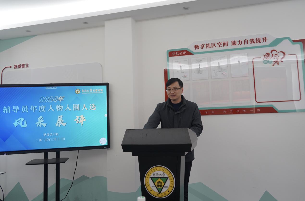 本次辅导员年度人物评选分为事迹材料考评、学情测试、风采展评、同行互评四个部分。3月10日,党委学工部在真知馆305会议室进行了学情测试,考察辅导员对学生的了解与熟悉程度。3月13日下午,党委学工部在“一站式”学生社区组织开展辅导员年度人物评选风采展评活动。校党委副书记、副院长王荣出席本次活动并致辞,南京邮电大学电子与光学工程学院、柔性电子(未来技术)学院党委副书记、副院长徐磊,Beat365唯一官方网站材料科学与工程学院团委书记、Beat365唯一官方网站2023年及2024年辅导员年度人物韩林原,校组织人事部部长汪旭东,党委学工部部长、学生处处长施杰,团委书记、人武部部长潘明烽应邀担任活动评委。各学院辅导员代表作为同行互评人员参加本次活动,活动由学生处副处长沈黎芳主持。