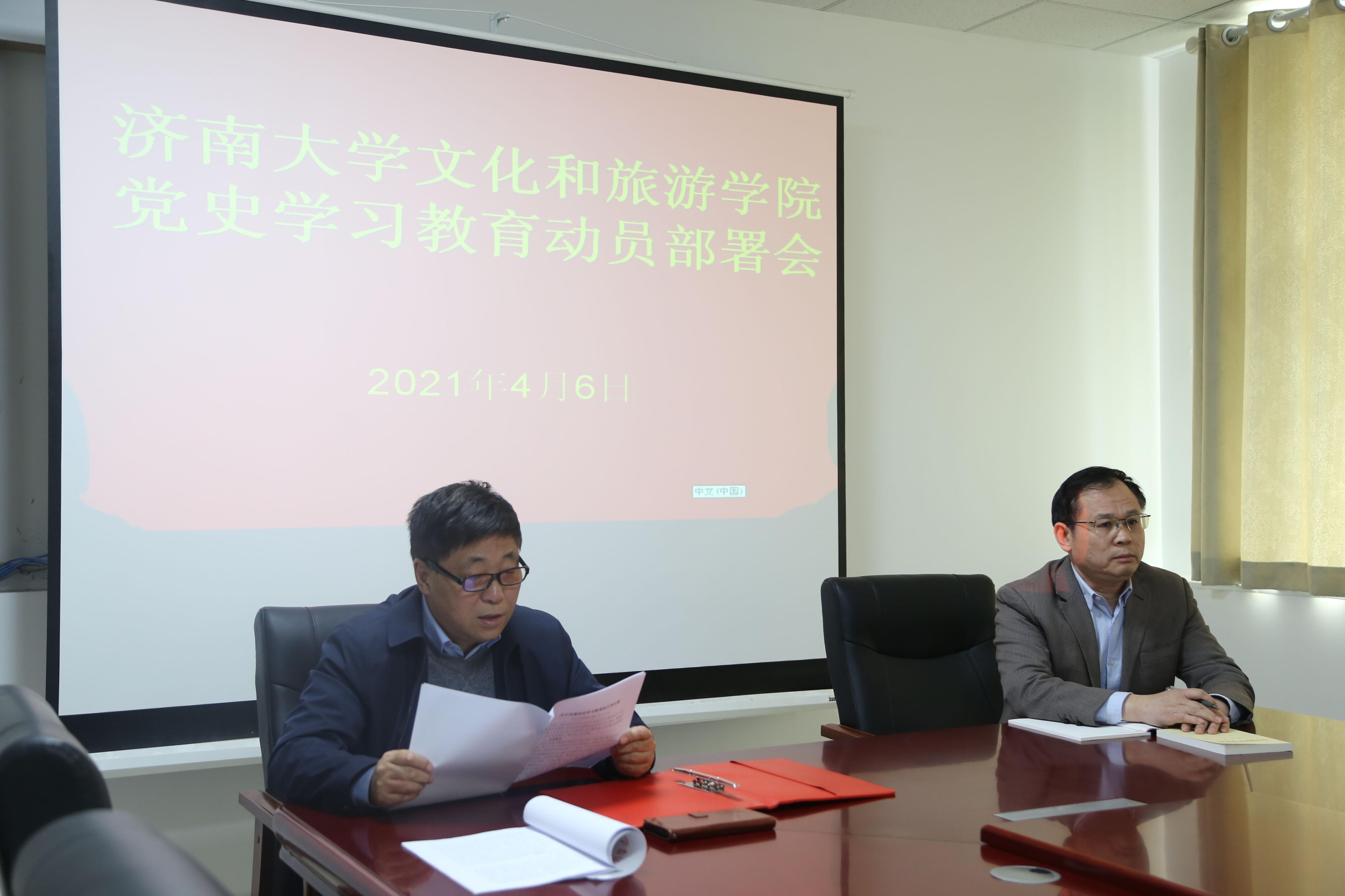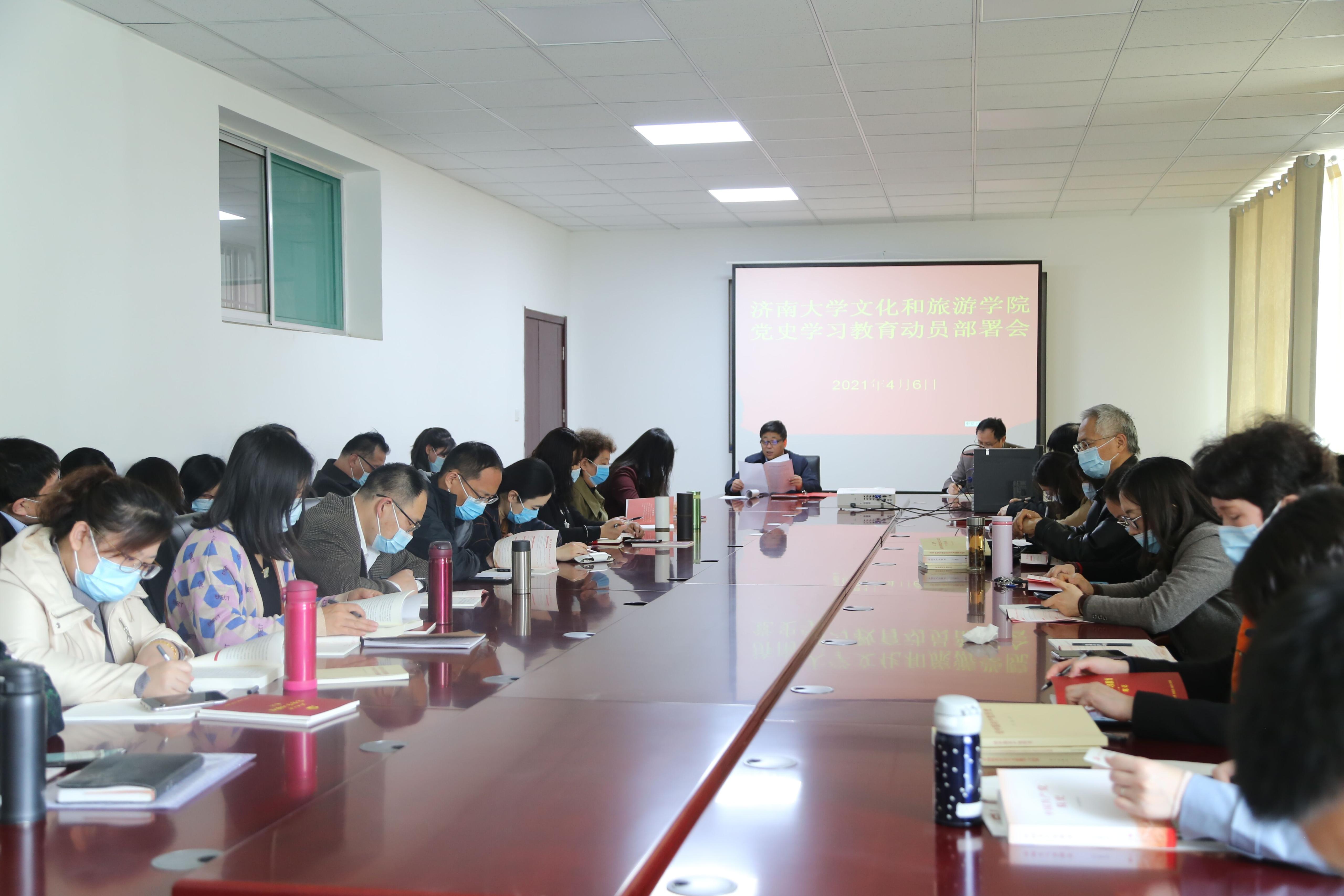 为深入贯彻落实习近平总书记在党史教育动员大会上重要讲话的精神,beat365英国官方网站根据学校党史学习教育工作的总体要求,于2021年4月6日下午两点半在beat365英国官方网站舜耕校区文旅楼212会议室举行“党史学习教育”动员部署会。会议由学院党委书记朱海涛主持,院长刘建波和全体教工党员参加。