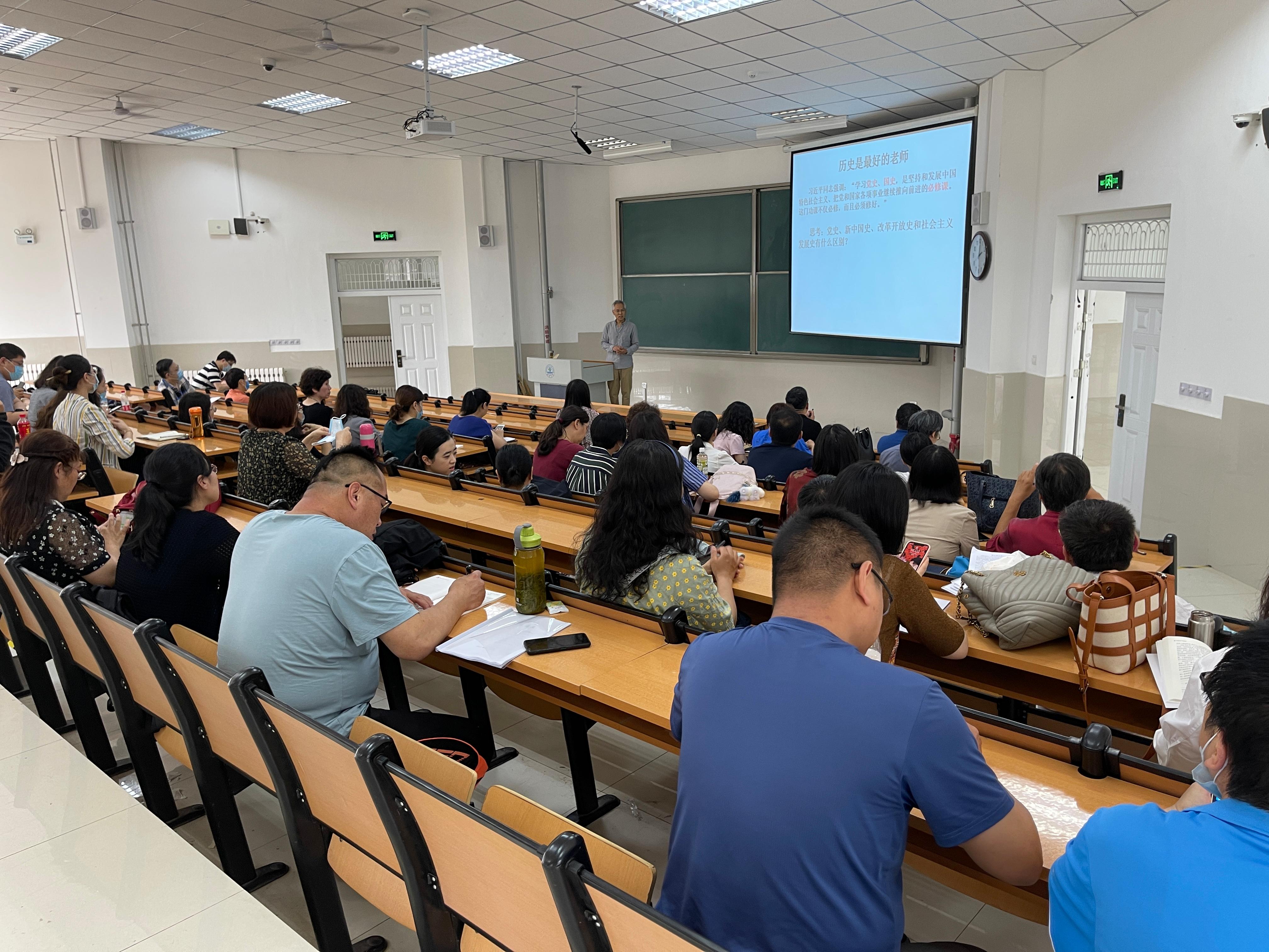 为深入贯彻落实习近平总书记在中共中央关于开展党史学习教育动员大会上的重要讲话精神,进一步牢记初心使命,坚定理想信念,激发担当作为,beat365英国官方网站根据学校党史学习教育工作的总体要求,落实“七个一”活动具体安排,于6月1日在舜耕校区第三教学楼101教室组织开展党史学习专题党课活动。党课由学院党委副书记孙成政主持,历史系主任高臻主讲,学院教工党员全员参加。