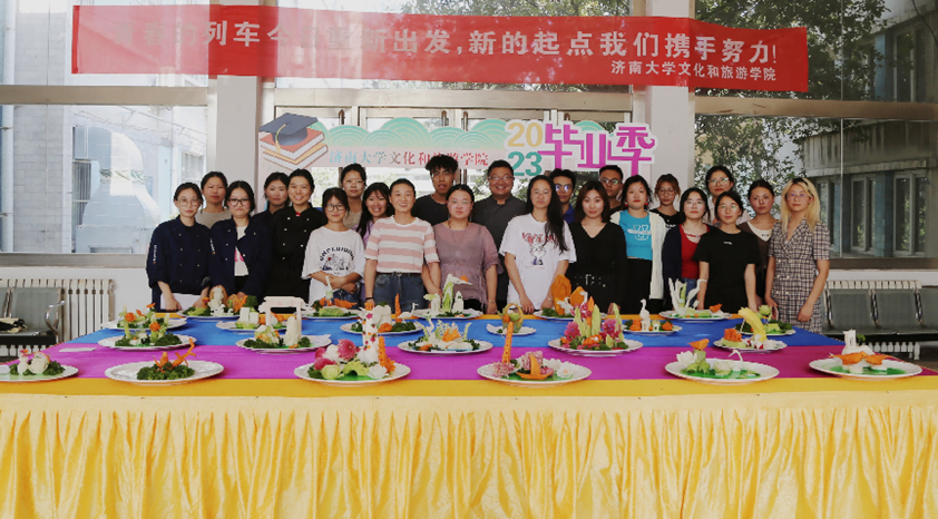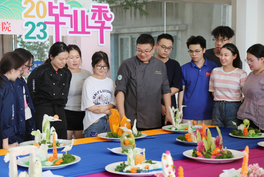 6月20日上午,beat365英国官方网站烹饪与营养教育专业大二学生于文旅楼大厅摆设食品雕刻展台,为2023届毕业生们送上最诚挚的祝福。各种寓有美意的食品展台齐聚一堂,供大家观赏。
